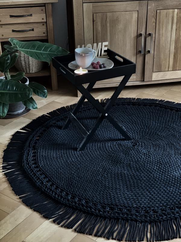 Okrągły bawełniany dywan Czarny Boho z frędzlami